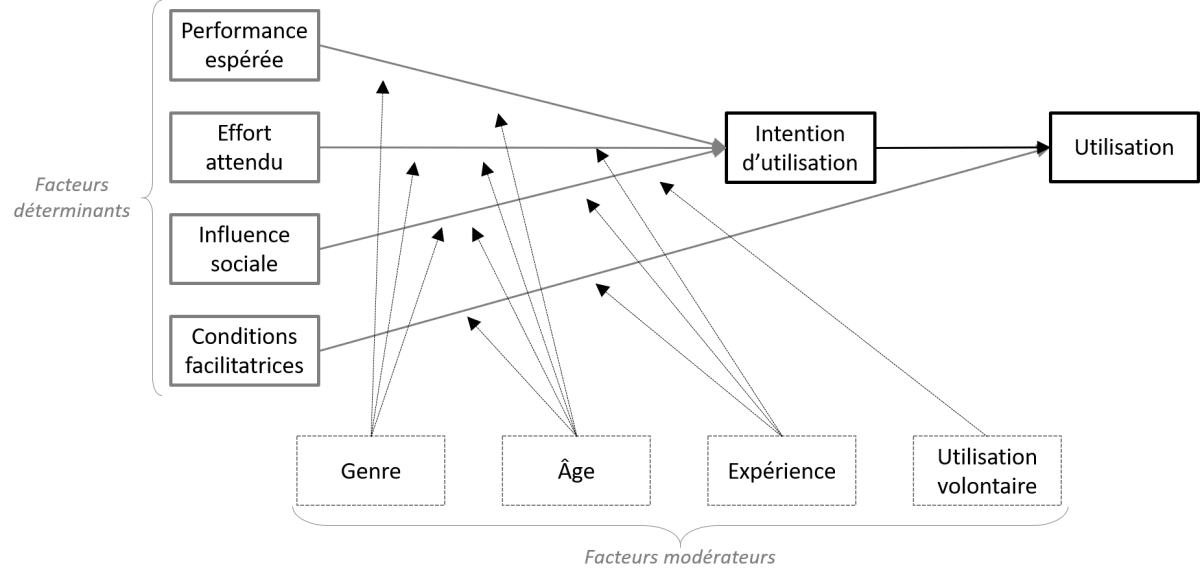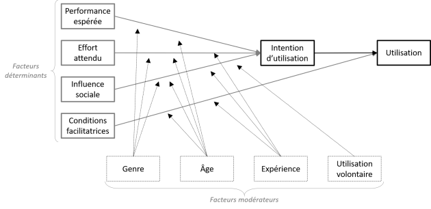 facteurs déterminants pouvant influencer l'intention d'utiliser une technologie ou son utilisation : la performance espérée, l'effort attendu, l'influence sociale, les conditions facilitatrices. Dans le contexte d'utilisation des consommateurs s'ajoutent comme facteurs la motivation hédonique, la valeur monétaire et l'habitude.