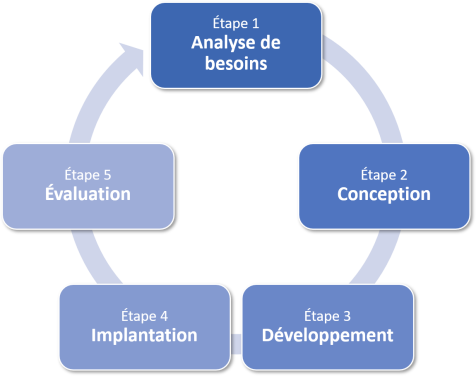 Vous croiserez dans votre vie professionnelle des situations où vous (ou votre milieu) implanterez une nouvelle solution documentaire : création d'une base de données, informatisation de votre collection, développement d'un site web, implantation d'un système de GED, etc. Pour arriver à bien le faire, il faut adopter une démarche systématique adaptée à la situation. C'est ce que l'on appelle une méthodologie. Bien que chaque type de solution documentaire possède une méthodologie qui lui est propre, on y retrouvera nécessairement les cinq étapes illustrées ci-dessous :