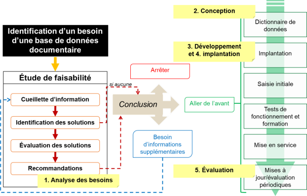Analyse des besoins : Cette étape correspond pour une base de données à l'étude de faisabilité. Il est intéressant de noter, d'une part, le "déclencheur" qui amène à démarrer le processus, soit l'identification d'un besoin pour ce type de solution documentaire et, d'autre part, le fait que l'étude de faisabilité ne mène pas toujours nécessairement à la mise en place de la solution. Il est possible que l'analyse des besoins et des ressources mène à la conclusion que ce projet n'est pas possible.