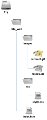 Par exemple, le chemin absolu du fichier internet.gif dans l'arborescence ci-dessous est C:\site_web\images\internet.gif. Remarquez la syntaxe : on débute par l'unité de stockage pour se rendre jusqu'au fichier en nommant, dans l'ordre, tous les dossiers parcourus pour s'y rendre. Sous Windows, on sépare les différents niveaux par le symbole de barre oblique inversée (\). Sous Mac OS et Linux, c'est le symbole de la barre oblique () qui est plutôt utilisé./