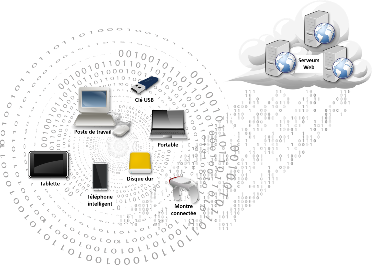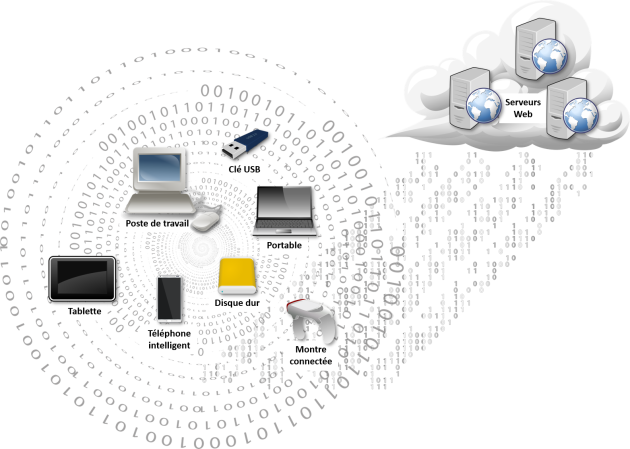 Pensez à votre journée d'hier et aux données numériques que vous avez créées, modifiées, consultées et essayez d'en faire la cartographie... Courriel (sur votre poste de travail, votre portable, votre téléphone intelligent, votre tablette et/ou sur un serveur de courriel)? Navigation sur Internet? Édition d'un document (en ligne ou sur votre ordinateur)? Vous ferez probablement le constat, (1) que vous avez utilisé de l'information numérique dans votre journée, (2) que cette information numérique venait de sources et d'environnements multiples. Et si vous essayiez maintenant de penser à où, physiquement ces informations résidaient, à comment elles sont organisées, il est possible que vous ne soyez pas nécessairement capable de répondre à cette question. Du fait de la multiplicité des espaces de stockage que l'on utilise, le portrait peut rapidement devenir assez complexe!