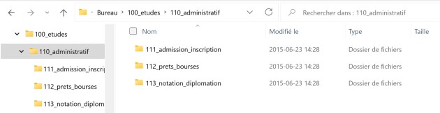 Taille des noms de fichiers : Toujours en raison du nombre de caractères maximal du chemin absolu d'un fichier, il est important que chacun des termes qui composent le nom d'un fichier soit court et significatif. Nous ajouterons à ce conseil fort judicieux un argument complémentaire : la signification d'un fichier repose sur son nom, mais aussi sur le nom des dossiers qui le contiennent. La hiérarchie apporte un contexte qu'il n'est pas nécessaire de dédoubler dans le nom du fichier comme tel. Par exemple, si vous conservez les procès-verbaux de votre unité dans un dossier nommé "proces_verbaux", il est inutile d'inclure le terme "proces_verbaux" dans les fichiers eux-mêmes à moins que ces fichiers se retrouvent parfois "hors contexte".