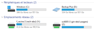 En cliquant sur Ce PC, on pourra voir la liste des unités de stockage « visibles » sur le poste de travail. Sous Windows, chacune est représentée par une lettre. On y retrouvera minimalement le disque dur du poste (ici C:) qui pourrait être partitionné (c'est-à-dire découpé en plusieurs unités). On pourra aussi y voir des périphériques de stockage amovibles comme un lecteur de disquette, une clé USB (ici D:). Finalement, on pourrait y retrouver des emplacements réseau, c'est-à-dire des unités de stockage accessibles via un réseau (ici Y: et Z:).