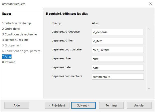 Finalement, si désiré, l'Assistant offre la possibilité de définir des chaînes de caractères plus explicites que les noms des champs (des alias) lors de l'affichage des résultats. Dans l'exemple ci-dessous, il a été décidé de conserver les noms des champs.
