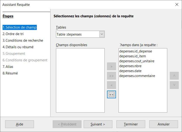 La personne novice en recherche d'information dans Base peut utiliser l'Assistant Requête. Comme illustré ci-dessous, cet assistant permet de graduellement définir les caractéristiques de la recherche en précisant premièrement les champs à utiliser et leurs provenances (tables ou requêtes), par exemple les champs de la table Depenses.
