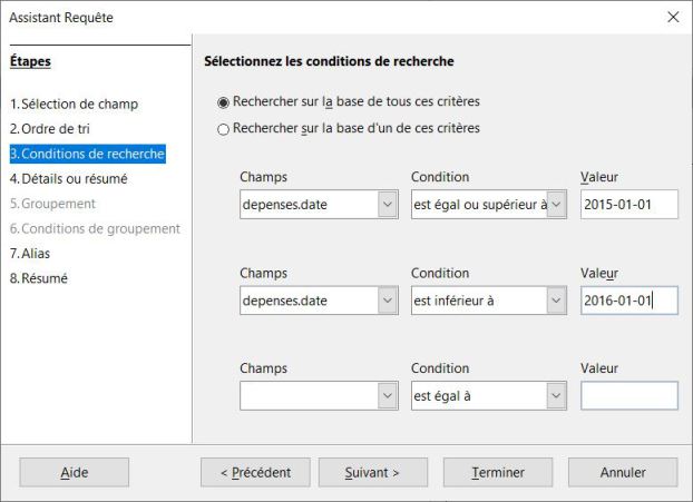 À l'étape suivante, il est possible de préciser des critères de recherche, c'est-à-dire des conditions à respecter pour retenir un enregistrement. Dans l'exemple ci-dessous, comme on ne veut que les dépenses pour l'année 2015, deux conditions ont été précisées qui doivent être toutes les deux respectées soit d'être une date (1) plus grande ou égale au 1er janvier 2015 et (2) aussi plus petite que le 1er janvier 2016.