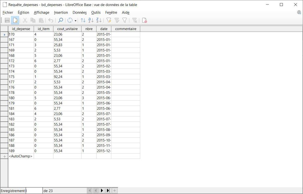 L'exécution de la requête montre bien qu'on ne retrouve que les dépenses de 2015 et que l'ordre de tri demandé a bien été respecté.