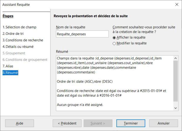 Un résumé des choix effectués est alors offert. Si on y trouve une erreur, il est possible de revenir aux étapes précédentes avec le bouton Précédent. C'est le temps de donner un nom significatif à la requête ainsi que de décider ce que l'on veut faire par la suite : afficher les résultats ou voir la requête en mode édition pour la modifier. Ce deuxième choix vient entre autres du fait qu'il n'est pas possible, avec l'Assistant, d'exploiter toutes les possibilités du langage d'interrogation. On peut ainsi utiliser l'Assistant pour faire un premier jet d'une requête pour la peaufiner par la suite soit en mode Ébauche ou en mode SQL (modes qui seront présentés plus loin).
