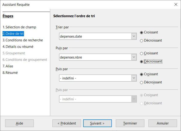 Par la suite, il permet d'identifier une ou des clés de tri pour imposer un ordre aux résultats de recherche. Par exemple, on peut demander de trier les résultats premièrement par date en ordre croissant et, advenant que deux enregistrements aient la même date, par le nombre d'items acheté en ordre décroissant.