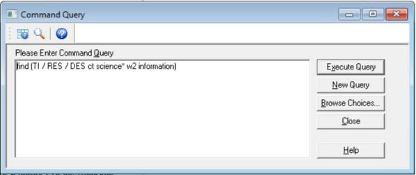 Le deuxième mode de recherche dans DB/TextWorks, la recherche en mode commande, vise cette fois les chercheuses et chercheurs d'information experts (par exemple, les professionnel(le)s de l'information). Comme illustré ci-dessous, il s'agit d'une simple boîte où l'on saisit l'équation de recherche. Une connaissance fine du langage d'interrogation (syntaxe et sémantique) ainsi que de la structure de la base de données est nécessaire pour pouvoir l'utiliser. Le mode commande pour la recherche experte permet de faire des recherches qui ne peuvent être faites à l'aide d'un bordereau de recherche; il est ainsi plus puissant.