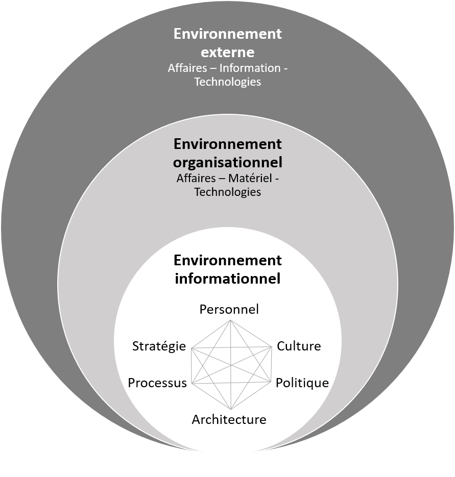L'environnement organisationnel est, quant à lui, imbriqué dans l'environnement externe, c'est-à-dire l'ensemble des éléments extérieurs à l'organisation qui ont une influence sur cette dernière dont le marché et les développements technologiques. Les technologies utilisées dans l'organisation seront ainsi potentiellement influencées par l'environnement externe de même que, par ricochet, les technologies en soutien à la gestion de l'information.