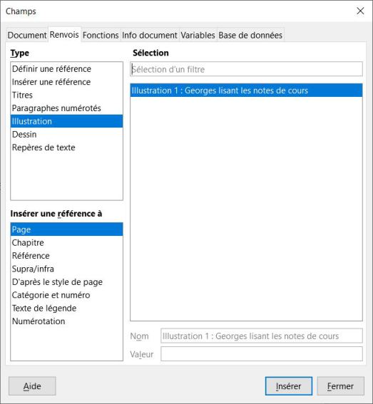Un avantage supplémentaire des légendes vient du fait qu'en marquant ainsi un objet dans un document, il est possible d'en exploiter la position dans un renvoi. Les légendes sont en quelque sorte des signets! On peut les exploiter en insérant un renvoi dynamique dans le texte comme, par exemple "(voir l'illustration 1 en page 2)".