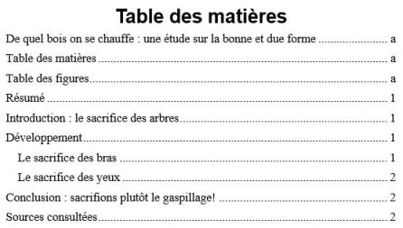 Les traitements de texte offrent un certain contrôle sur la table des matières générée, notamment le choix du nombre de niveaux à inclure. La mise en page peut varier sur certains points, mais les tables des matières se présenteront sous forme hiérarchique, comme illustré ci-dessous.