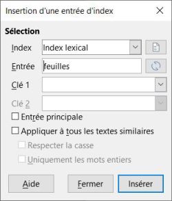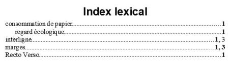 Dans un deuxième temps, on peut insérer dans le document un index qui identifiera les entrées d'index ajoutées dans le texte pour générer automatiquement l'index. Cet index pourra être mis à jour au fur et à mesure de la rédaction du document.