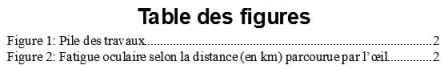 C'est l'insertion de légendes qui permettra d'ajouter une table (index) des figures ou des tableaux dans un document. La liste présentera le numéro de la figure ou du tableau ainsi que son titre et, finalement, la page où l'élément apparaît. Cette liste est dynamique et pourra être mise à jour, souvent à partir de son menu contextuel, pour tenir compte des modifications du document.