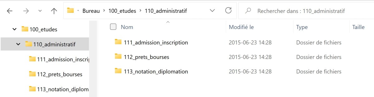 Taille des noms de fichiers : Toujours en raison du nombre de caractères maximal du chemin absolu d'un fichier, il est important que chacun des termes qui composent le nom d'un fichier soit court et significatif. Nous ajouterons à ce conseil fort judicieux un argument complémentaire : la signification d'un fichier repose sur son nom, mais aussi sur le nom des dossiers qui le contiennent. La hiérarchie apporte un contexte qu'il n'est pas nécessaire de dédoubler dans le nom du fichier comme tel. Par exemple, si vous conservez les procès-verbaux de votre unité dans un dossier nommé "proces_verbaux", il est inutile d'inclure le terme "proces_verbaux" dans les fichiers eux-mêmes à moins que ces fichiers se retrouvent parfois "hors contexte".