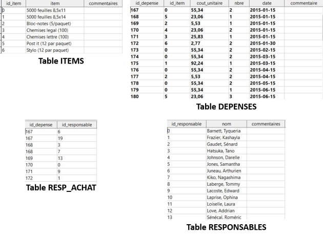 On ne peut ainsi y retrouver d'occurrences multiples. C'est ce qui explique la table RESP_ACHAT qui permet d'associer plus d'un.e responsable à un achat. Remarquez dans cette table, pour la dépense #167, qu'on retrouve justement deux lignes, une ligne par responsable.
