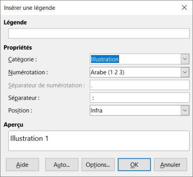 Lorsque l'on procède à l'ajout d'une légende, les traitements de texte permettent habituellement de choisir parmi des catégories existantes (par exemple, Figure, Tableau) et même d'en créer de nouvelles. Comme illustré ci-dessous, dans Writer, il est aussi possible de choisir le type de numérotation désiré ainsi que de positionner la légende par rapport à l'objet auquel elle est associée.