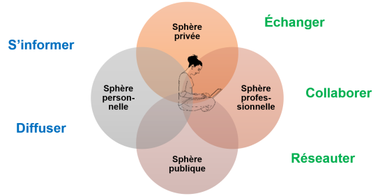 Dans l'univers du Web 2.0, on observe que les sphères publique et privée, personnelle et professionnelle deviennent perméables, leurs frontières étant plus floues. Par exemple, certains blogueurs mélangent parfois anecdotes personnelles et réflexions liées à leur travail sur leurs blogues. Le caractère privé de certaines formes d'expression, comme les journaux intimes, s'ouvre à la sphère publique, par exemple sur les blogues et les réseaux sociaux.