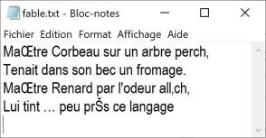 Dans d'autres cas, le fichier contient uniquement des caractères alphanumériques (c'est-à-dire des lettres, des chiffres et quelques symboles) sans aucune mise en forme, un contenu beaucoup plus simple que celui d'une image! L'interprétation de son format peut alors se faire par l'utilisation d'une simple table de correspondance entre des suites de 0 et de 1 et des caractères alphanumériques (ce que l'on appelle un jeu de caractères; cette notion sera abordée un peu plus loin). Ainsi, un éditeur de texte simple comme Bloc-notes (Windows) peut arriver à l'interpréter. C'est ce que l'on appelle un fichier en format texte.