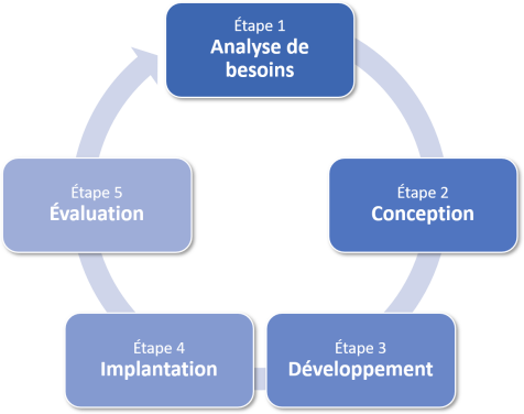 Vous croiserez dans votre vie professionnelle des situations où vous (ou votre milieu) implanterez une nouvelle solution documentaire : création d'une base de données, informatisation de votre collection, développement d'un site web, implantation d'un système de GED (gestion électronique de documents), etc. Pour arriver à bien le faire, il faut adopter une démarche systématique adaptée à la situation. C'est ce que l'on appelle une méthodologie. Bien que chaque type de solution documentaire possède une méthodologie qui lui est propre, on y retrouvera nécessairement les cinq étapes illustrées ci-dessous :