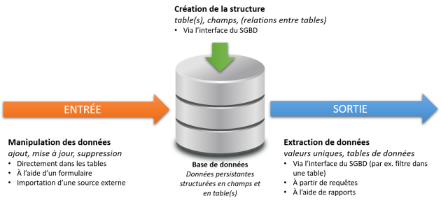 Nous nous sommes attardés la semaine dernière sur certains modèles de données pour comprendre la structuration de l'information et les opérations qui leur sont propres. C'est ce modèle de données qui influencera la modélisation de la structure des données dans une base de données, tâche centrale à son développement. Mais il n'y a pas que la structure de données à créer. Le concepteur ou la conceptrice d'une base de données doit prendre en considération l'ensemble des processus liés à la création de la structure de données, à la manipulation des données et à l'extraction des données :